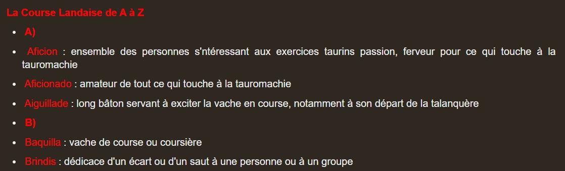 Encierro (ou enciero) : mot d'origine espagnole signifiant "enfermé" à l'origine, les taureaux étaient amenés aux arènes, poussés par des cavaliers et des gens à pied. aujourd'hui cette pratique a fait diversion et est devenue un "jeu" taurin : des taureaux sont lâchés en groupe dans les rues barricadées, protégées par des barrières, devant lesquels courent des courageux et des téméraires